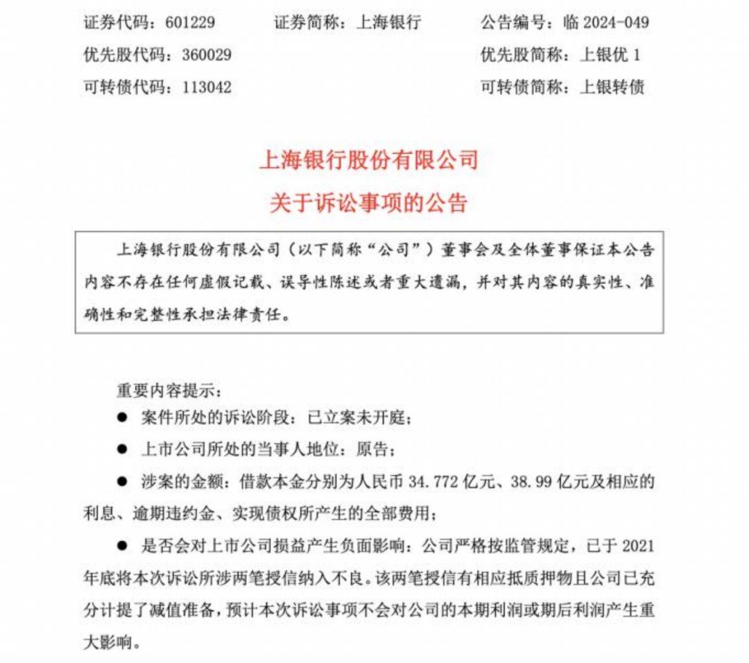 另外,据上海银行发布的诉讼公告显示,该两笔授信有相应抵质押物且公司已充分计提了减值准备,预计本次诉讼事项不会对公司的本期利润或期后利润产生重大影响。