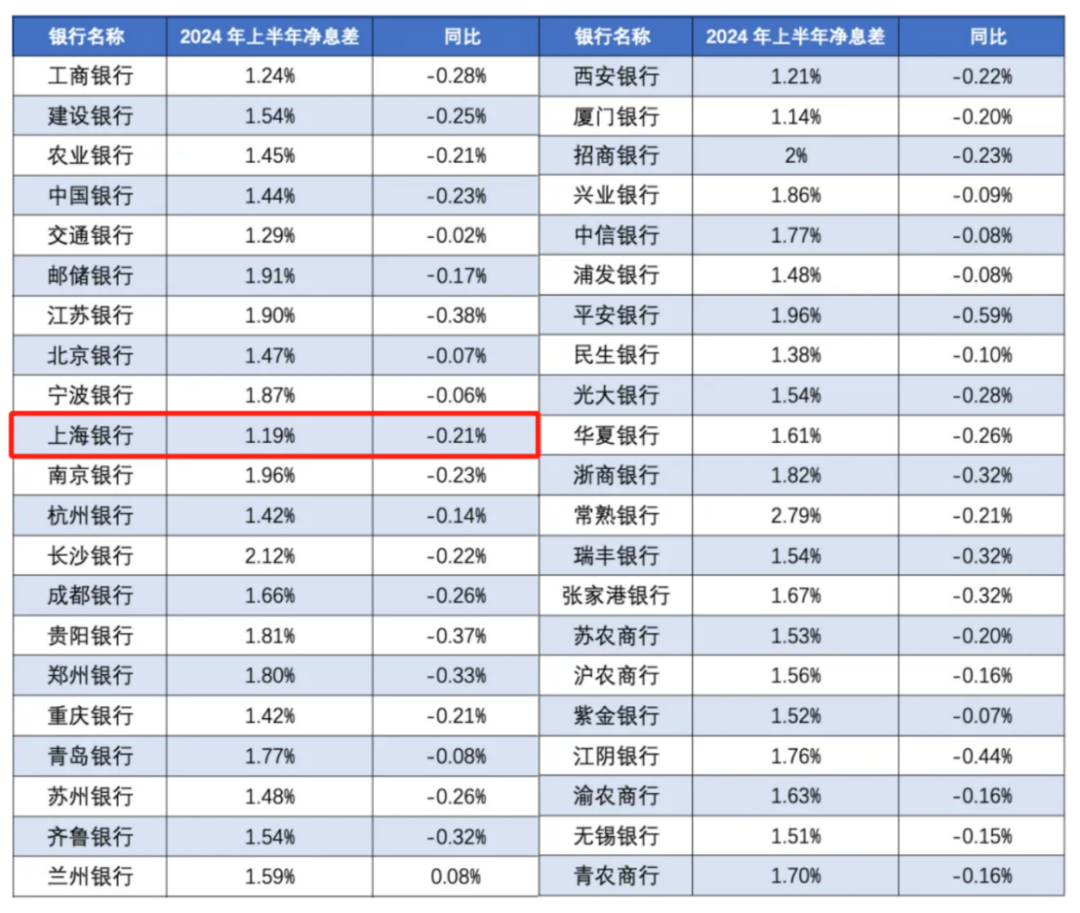 据尺度商业梳理,2024年上半年,在A股42家上市银行中,上海银行的净息差已排名倒数第二,仅高于厦门银行的1.14%。
