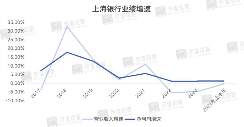 但此后上海银行业绩增速逐步进入下降通道,2022年以来营业收入增速已经降为负值,净利润仅为1%出头,近乎停滞。2024年上半年,实现营收262.47亿,同比下降0.43%;净利润129.69亿,同比增长了1.04%。