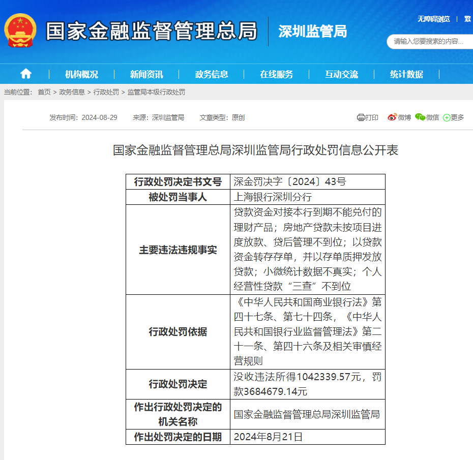2024年8月,上海银行深圳分行被监管部门查获“房地产贷款未按项目进度放款、贷后管理不到位”、“贷款资金对接本行到期不能兑付的理财产品”、“以贷款资金转存存单,并以存单质押发放贷款”等多项违法违规行为。国家金融监督管理总局深圳监管局对该行处以没收违法所104.23万元,并罚款368.47万元重罚。