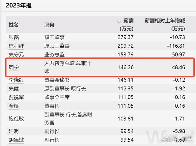 根据年报披露,周宁去年薪酬为146万元,在高层中位列第四,比2022年增加48万元,和董秘薪酬基本相当,高于原行长和董事长。