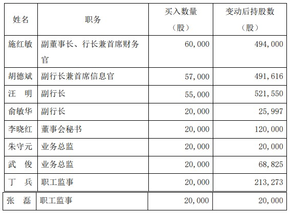 此外,副行长兼首席信息官胡德斌增持5.7万股,增持金额46.26万元,副行长汪明增持5.5万股,增持金额44.63万元,副行长俞敏华、董事会秘书李晓红等6名高管和监事分别增持2万股,增持金额均为16.23万元。