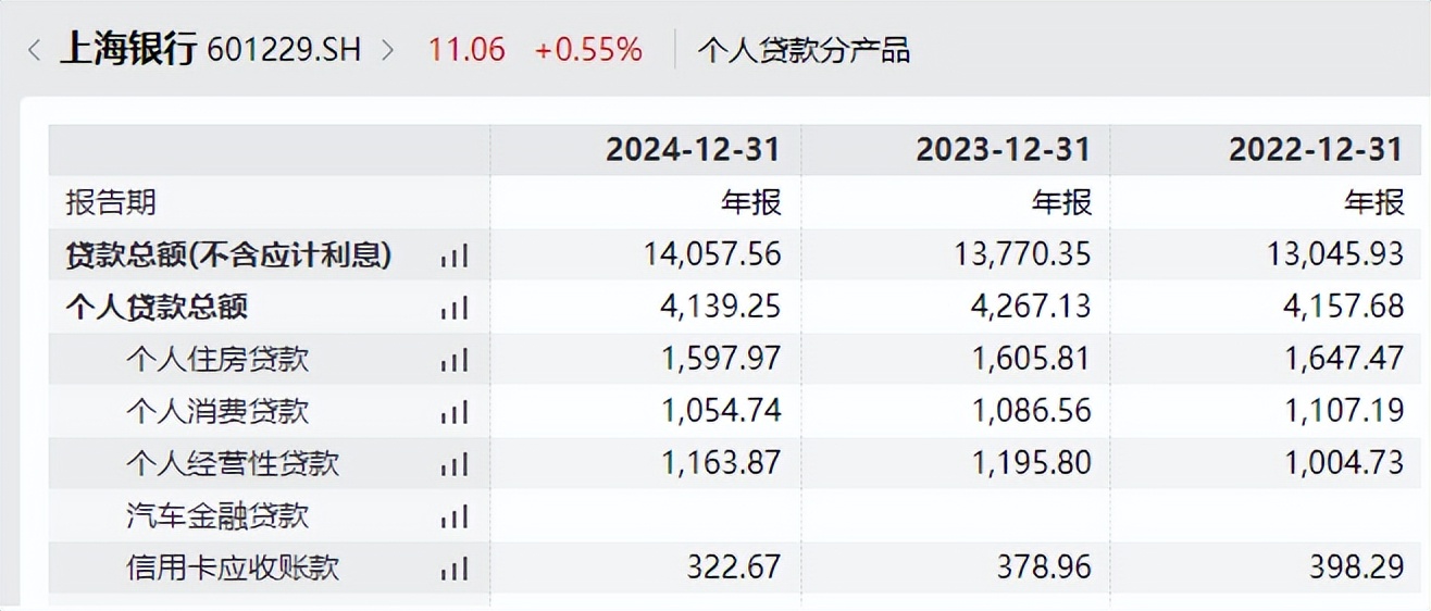 信用卡业务萎缩,只是上海银行个人贷款减少的一个缩影。2024年末,上海银行的个人贷款约为4139.25亿元,较2023年末的4267.13亿元减少约127.88亿元。