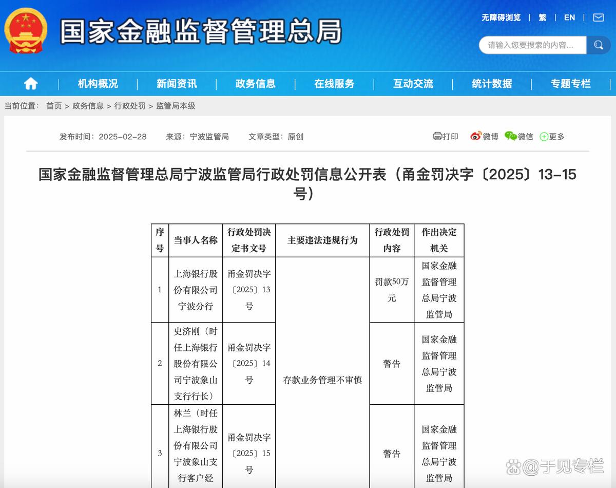 除了理财风险外,上海银行频繁受到监管处罚,也折射出其内控体制的脆弱性,甚至可能存在着致命的系统性缺陷。例如,今年2月底,国家金融监督管理总局宁波监管局行政处罚信息公开表显示,上海银行宁波分行,因存款业务管理不审慎,被罚款50万元。