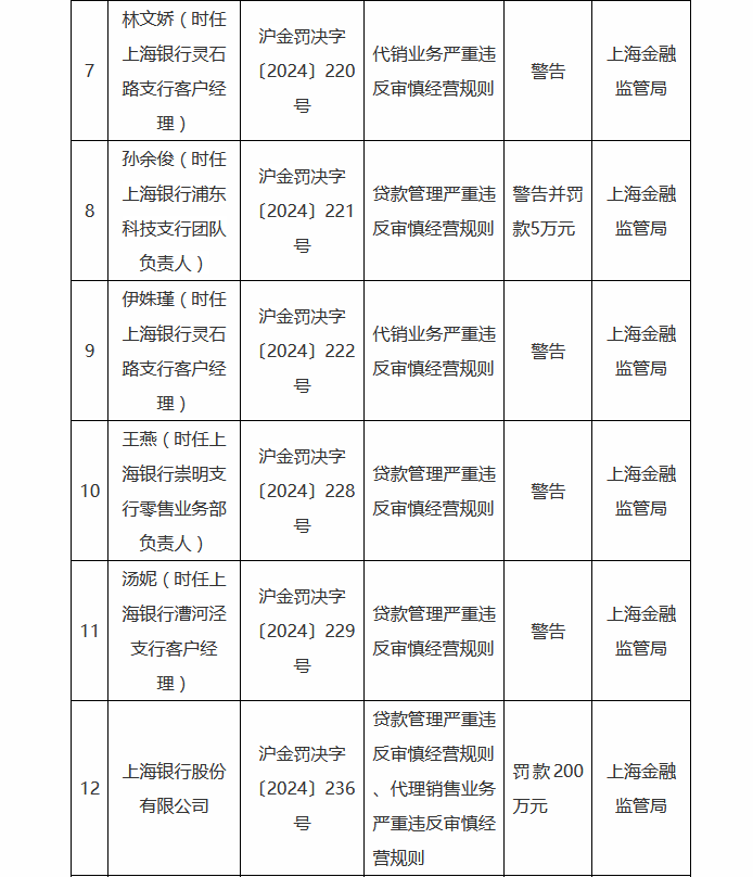 1月2日,国家金融监督管理总局公布6张行政处罚信息公开表(沪金罚决字〔2024〕220号、221号、222号、228号、229号、236号)“剑指”上海银行。其中,时任上海银行灵石路支行客户经理的林文娇、伊姝瑾因代销业务严重违反审慎经营规则,均被监管部门警告;时任上海银行浦东科技支行团队负责人的孙余俊因贷款管理严重违反审慎经营规则,被处以警告并罚款5万元;时任上海银行崇明支行零售业务部负责人的王燕、时任上海银行漕河泾支行客户经理的汤妮均因贷款管理严重违反审慎经营规则被警告。此外,上海银行因贷款管理严重违反审慎经营规则、代理销售业务严重违反审慎经营规则被罚款200万元。