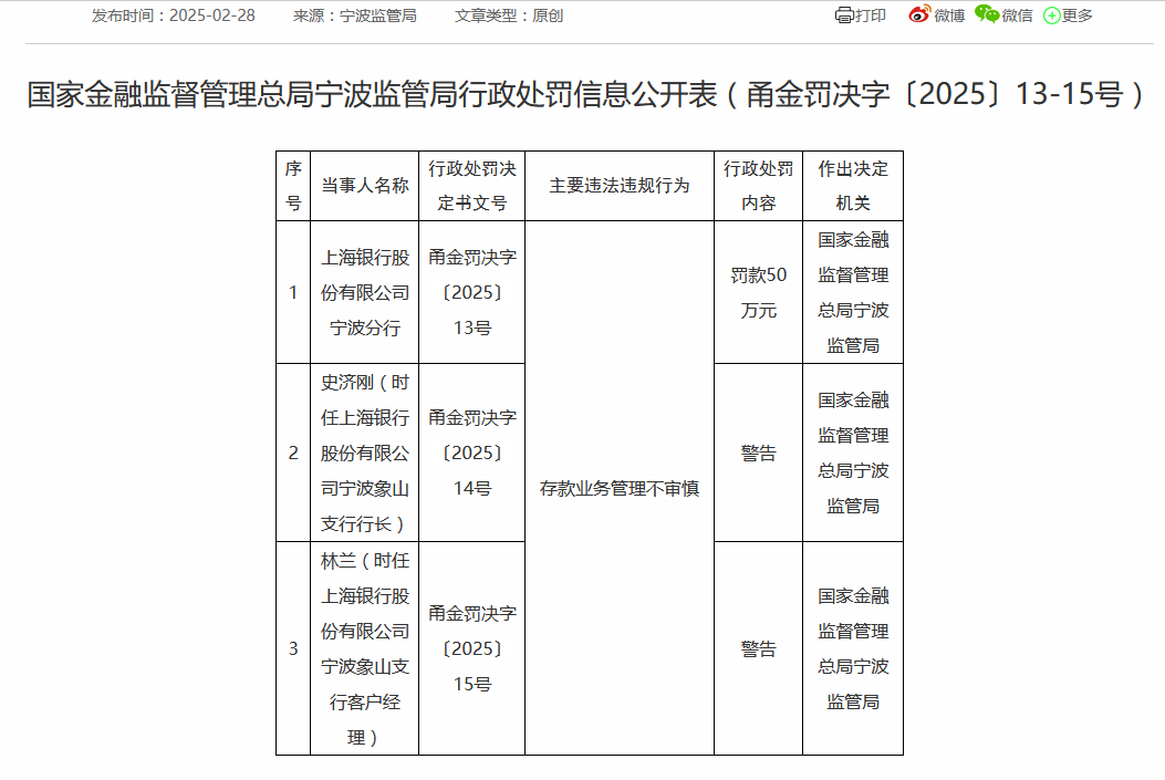随后,2月28日,国家金融监督管理总局宁波监管局公布了一批罚单,上海银行再次被罚。根据行政处罚信息公开表(甬金罚决字〔2025〕13-15号),上海银行宁波分行因存款业务管理不审慎被罚款50万元,两位相关负责人被监管部门警告。