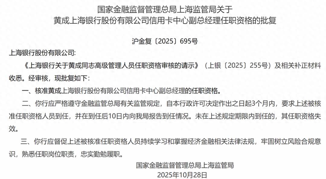 近日,国家金融监督管理总局上海监管局官网显示,黄成上海银行信用卡中心副总经理任职资格获得监管批复。