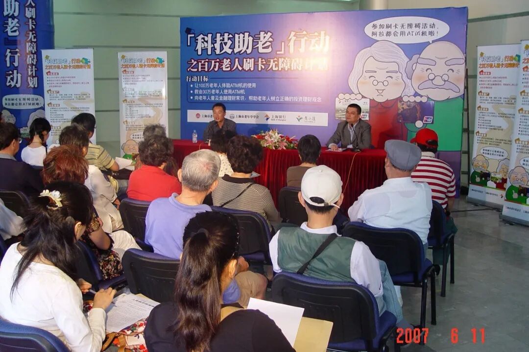上海银行 敏锐觉察到养老客户服务更深层次、精细化的需求变迁,着力开展厅堂为主阵地的适老化改造。2007年,上海市启动“科技助老”行动, 上海银行 与 上海市老年基金会 、 上海市老年学学会 共同策划组织“科技助老——百万老人刷卡无障碍计划”, 上海银行 导银志愿者由此诞生。每到领取养老金的高峰日,400多名“导银”志愿者在 上海银行 近200个网点驻守,通过“老人帮老人”的方式,教老年客户使用自助机具,消除他们对自助机具的陌生感,大大缓解高峰日老人长时间排队等候情况。