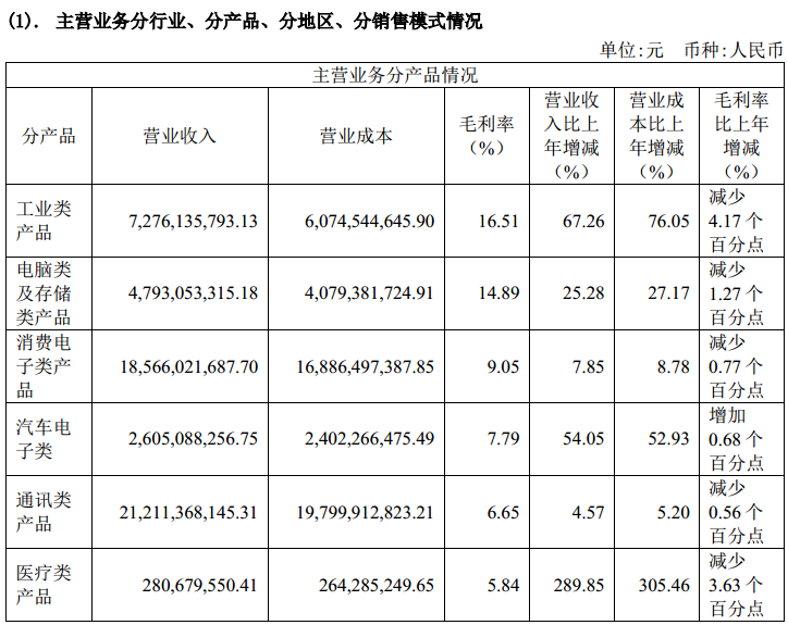具体看来,2021年,该公司旗下通讯类产品营收212.11亿元,同比增长4.57%,毛利率同比减少0.56个百分点至6.65%;消费电子类产品营收185.66亿元,同比增长7.85%,毛利率较上年同期减少0.77个百分点至9.05%;工业类产品营收72.76亿元,同比增长67.26%,毛利率较上年减少4.17个百分点至16.51%;电脑及存储类产品营收47.93亿元,同比增长25.28%,毛利率较上年同期减少1.27个百分点至14.89%;汽车电子类产品营收26.05亿元,同比增长54.05%,毛利率较上年增加0.68个百分点至7.79%。