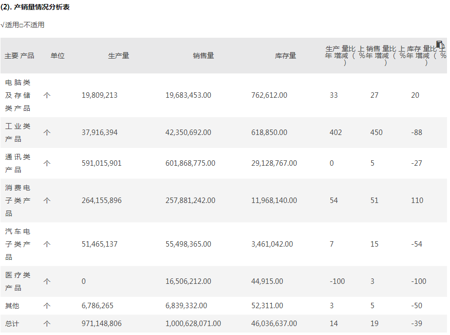 从产销情况来看,环旭电子旗下产品整体销售量增加19%至10亿个,生产量增加14%至9.71亿个,库存量收缩39%至4603.66万个。具体来看,该公司旗下医疗类产品去年销售量增加3%至1650.62万个,但其库存量仅44915个,生产量为0;汽车电子类产品的销售量也同比增加15%至5549.84万个,去年生产量同比增7%至5146.51万个,其库存量为346.1万个,库存量收缩54%;工业类产品的销售量、生产量分别增加450%、402%,销售量合计4235.07万个,生产量是3791.64万个,库存量较上年同期下滑88%至61.89万个;通讯类产品产量保持恒定5.92亿个,销售量增5%至6.02亿个,库存量收缩27%至2912.88万个。