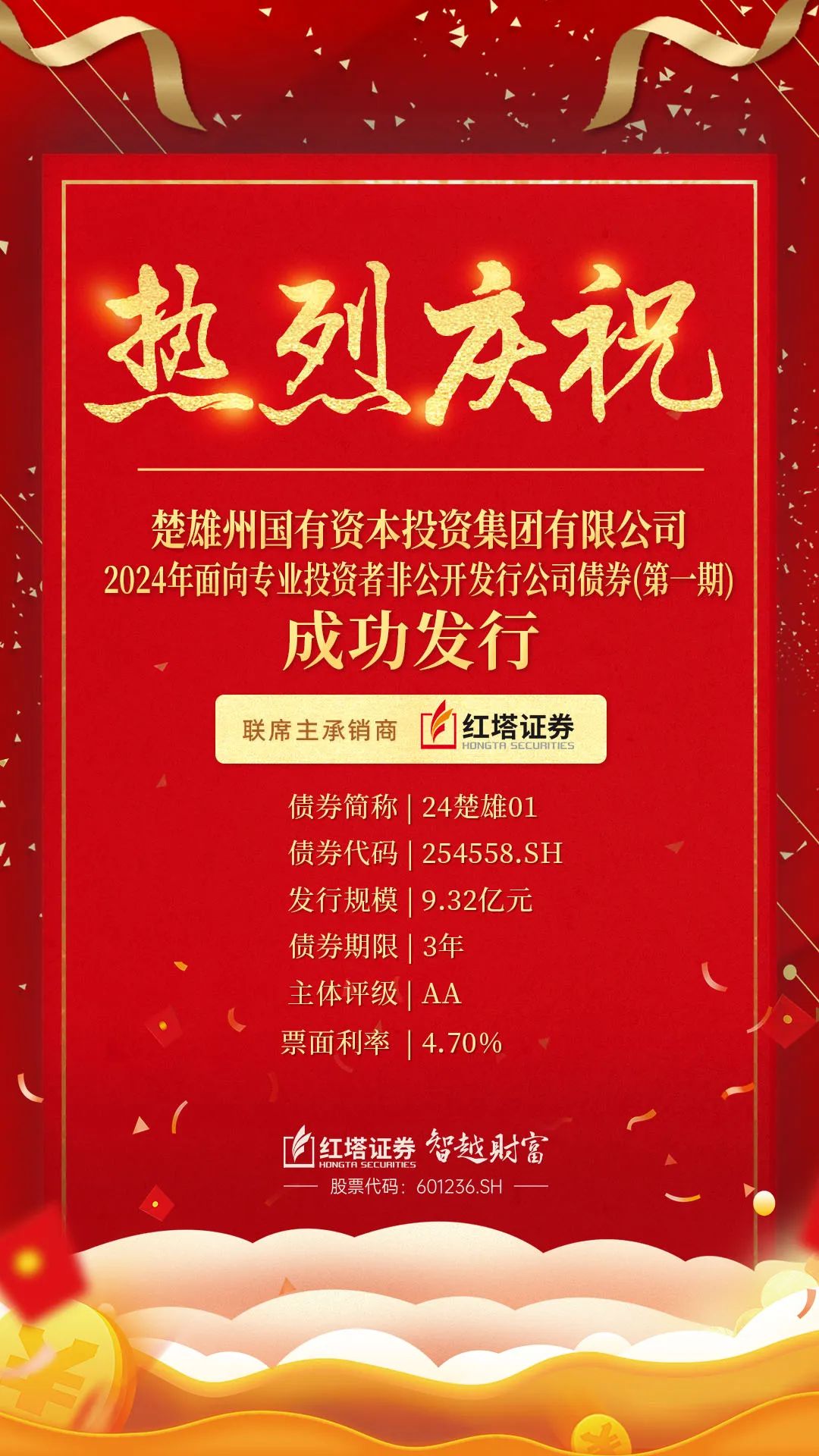 2024年4月22日,由红塔证券担任联席主承销商的楚雄州国有资本投资集团有限公司2024年面向专业投资者非公开发行公司债券(第一期)在上交所成功发行。红塔证券始终立足本土市场,牢牢把握中央及各级监管部门的政策导向,充分发挥区位优势,利用资本市场筹措资金,通过与投资者积极沟通,为楚雄国投通过借新还旧的方式化解存量债券提供有力支持,有效推动了项目发展。本次债券募集规模9.32亿,票面利率4.70%,期限3年,认购倍数3.43倍,市场投资者认购踊跃。