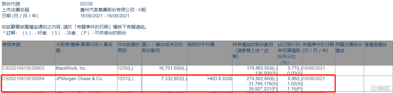 格隆汇APP获悉,根据联交所最新权益披露资料显示,2021年9月10日,广汽集团(02238.HK)遭JPMorgan Chase & Co.以每股均价8.333港元减持好仓733.27万股,涉资约6110.3万港元。