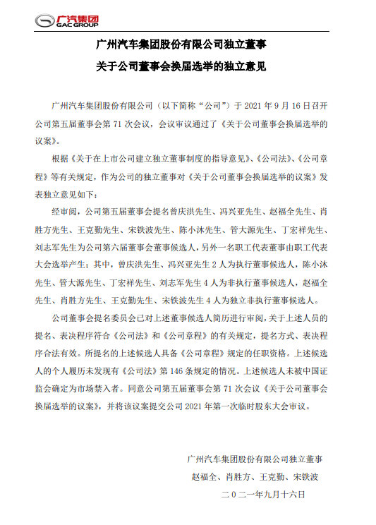 9月16日,广汽集团(601238.SH)发布公告称,公司第五届董事会第71次会议审议通过了《关于公司董事会换届选举的议案》(以下简称《议案》)。