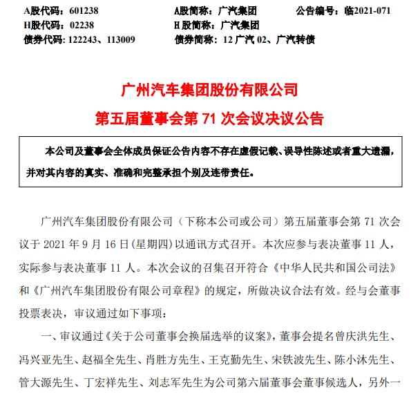 昨日,广州汽车集团股份有限公司(A股股票代码:601238 H股股票代码:2238)发布第五届董事会第71次会议决议公告,审议并通过《关于公司董事会换届选举的议案》,董事会提名曾庆洪等人为公司第六届董事会董事候选人;其中,曾庆洪、冯兴亚2人为执行董事候选人。