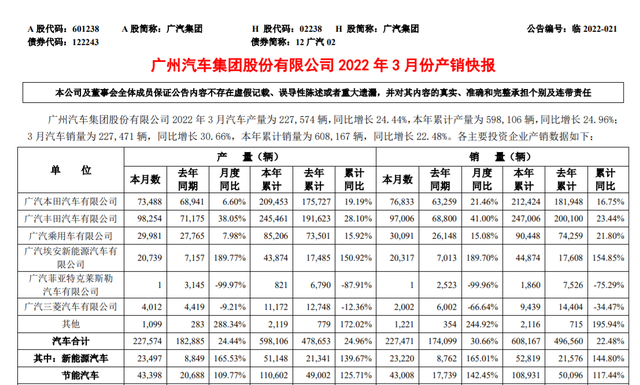 近日,广汽集团公布了3月份销量情况:共计销售新车227471辆,同比增长30.66%,环比大增58.6%。