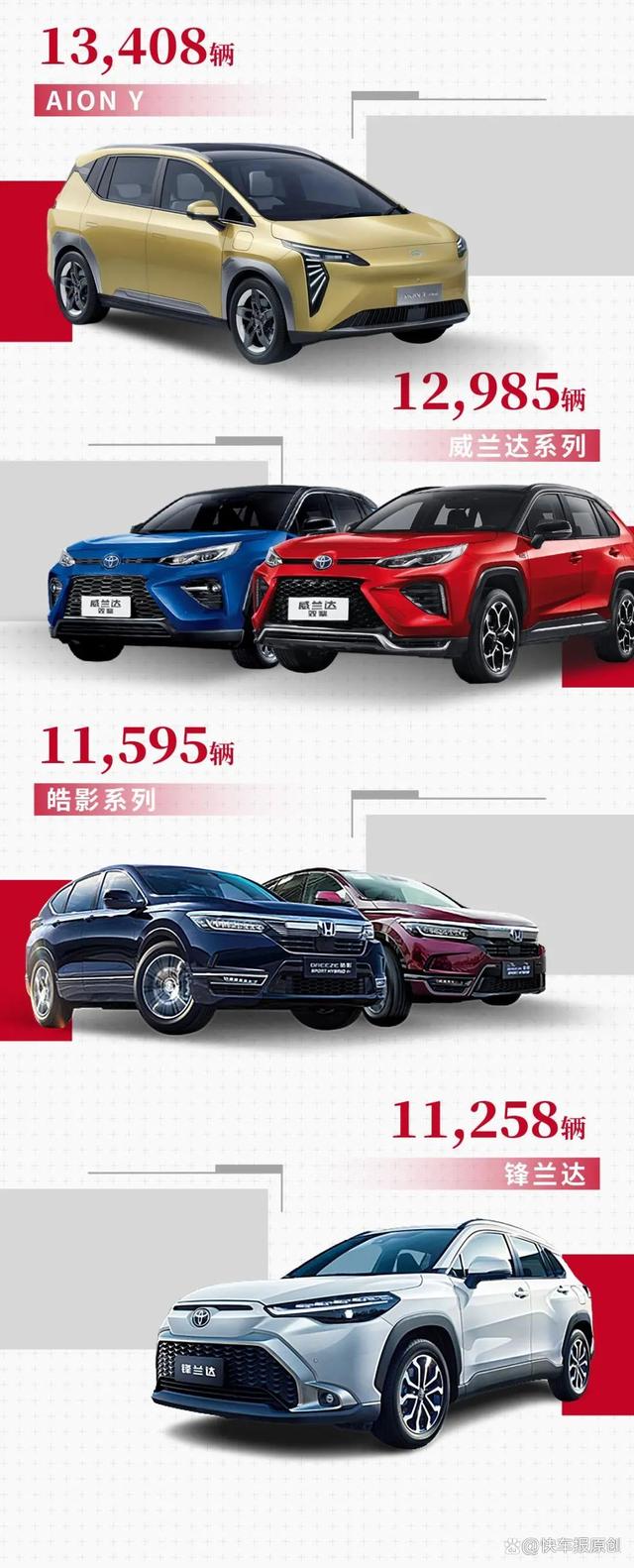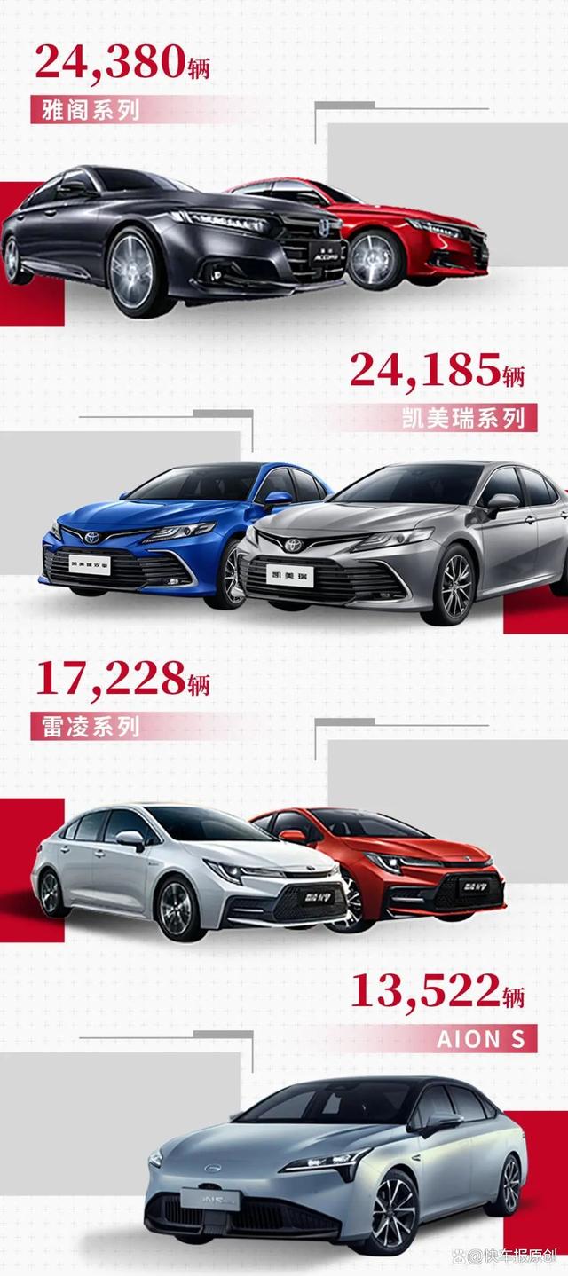 至于广汽集团9月卖得最好的8款车型,依旧都是那些老面孔,只是排序上稍微有点变化,广汽本田的雅阁系列和广汽丰田的凯美瑞系列,稳占第一、二名的位置,广汽丰田雷凌照样是季军。广汽埃安的AION S和AION Y则非常争气,位置紧跟其后。