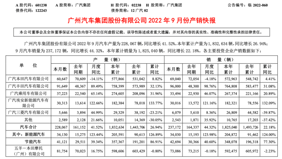 数据显示,广汽集团9月销量23.72万辆,同比增长44.32%,前三季度累计销售182.5万辆,同比增长22.18%,相对全年246.6万辆的目标完成度74.01%。