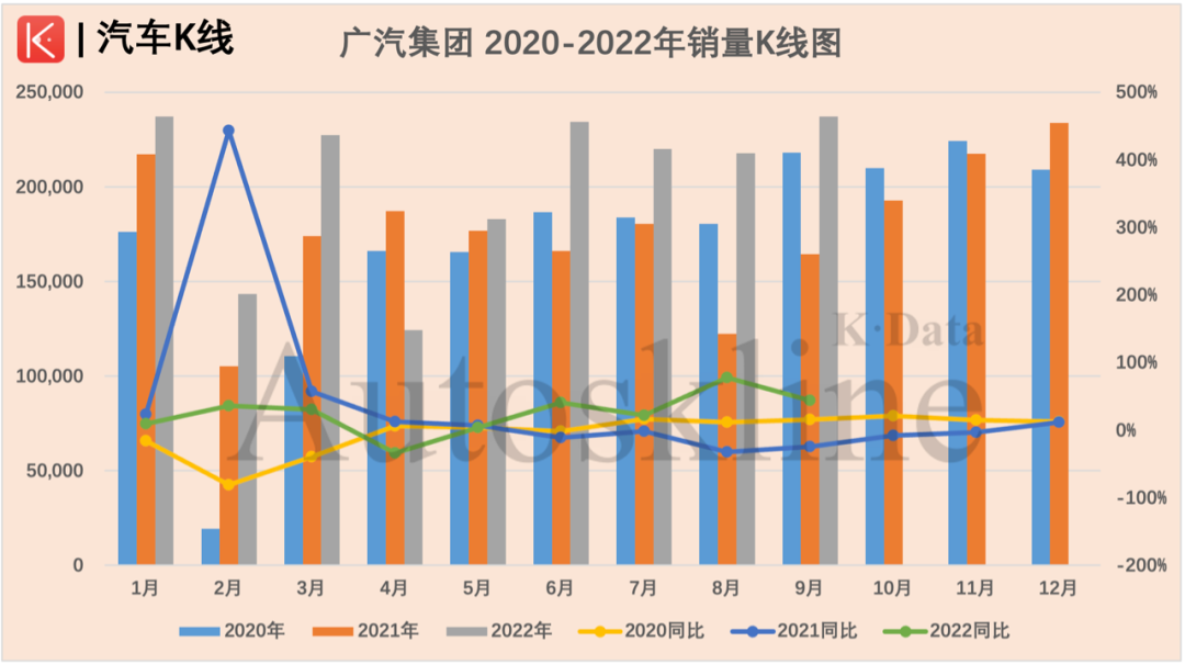 现在再来看广汽集团在2022年最近几个月的产销走势,尽管在7月追平了上年同期的累计产销水平,然而到了8月却开始出现单月产销环比连续下滑的表现,在9月则直接是同环比全面下行。