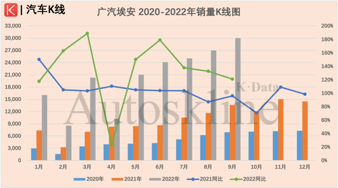 9月,埃安生产3.03万辆,同比增长122.66%,销售3万辆,同比增幅121.16%,同时更是得益于2022年1-9月均保持同比增长(实际上从2021年1月拆分报数起,至今埃安仍保持单月同比增长),埃安当前累计产销增幅分别达到133.77%、132.09%,快速逼近广汽乘用车的产销水平,跻身广汽集团TOP 3指日可待。
