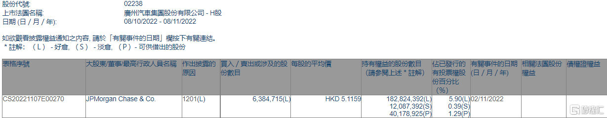 根据联交所最新权益披露资料显示,2022年11月2日,广汽集团(02238.HK)遭JPMorgan Chase & Co.以每股均价5.1159港元减持好仓638.47万股,涉资约3266.36万港元。