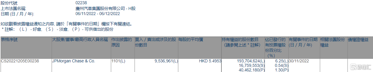 根据联交所最新权益披露资料显示,2022年11月30日,广汽集团(02238.HK)获JPMorgan Chase & Co.以每股均价5.4953港元增持好仓953.7万股,涉资约5240.85万港元。