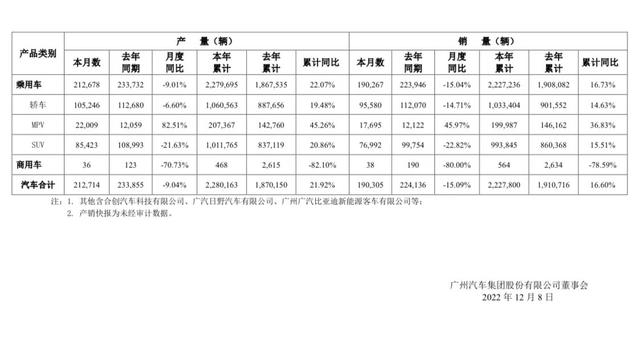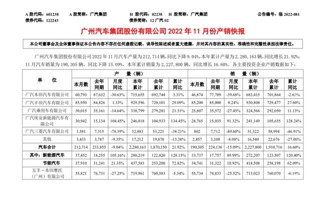 12月8日,广汽集团公布2022年11月份产销快报,据悉11月汽车销量同比下降,但新能源汽车表现依旧出色。