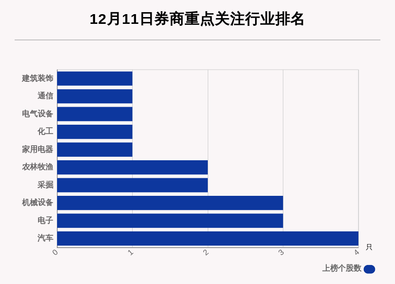 从券商对行业的关注度来看,券商关注个股数居前的行业分别是汽车、电子、机械设备。