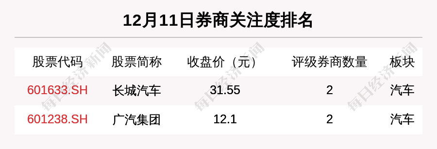 从券商对个股的关注程度来看,有2只个股获得多家券商关注,券商关注数量排名居前的个股是长城汽车(601633.SH)、广汽集团(601238.SH)。