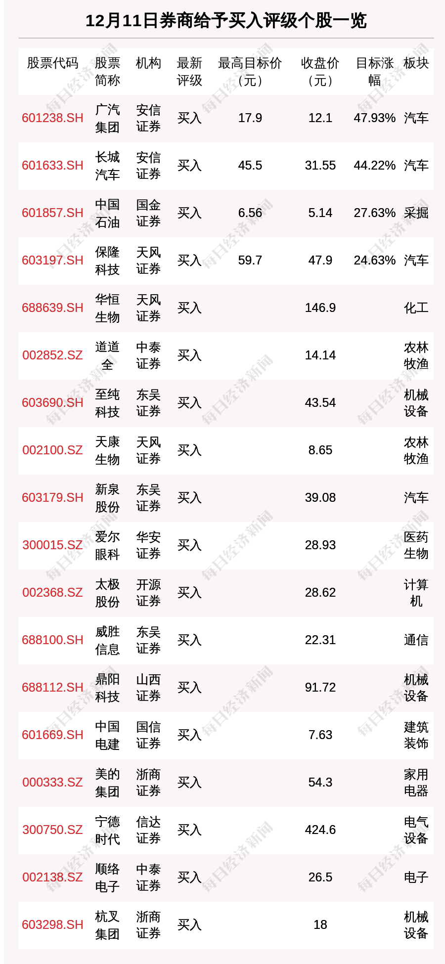 12月11日,券商给予评级的个股数共有21只,获得买入评级的个股数共有18只。在公布了目标价格的4只个股中,按照最新收盘价计算,预期涨幅排名居前的个股是广汽集团(601238.SH)、长城汽车(601633.SH)、中国石油(601857.SH),预期涨幅分别是47.93%、44.22%、27.63%。