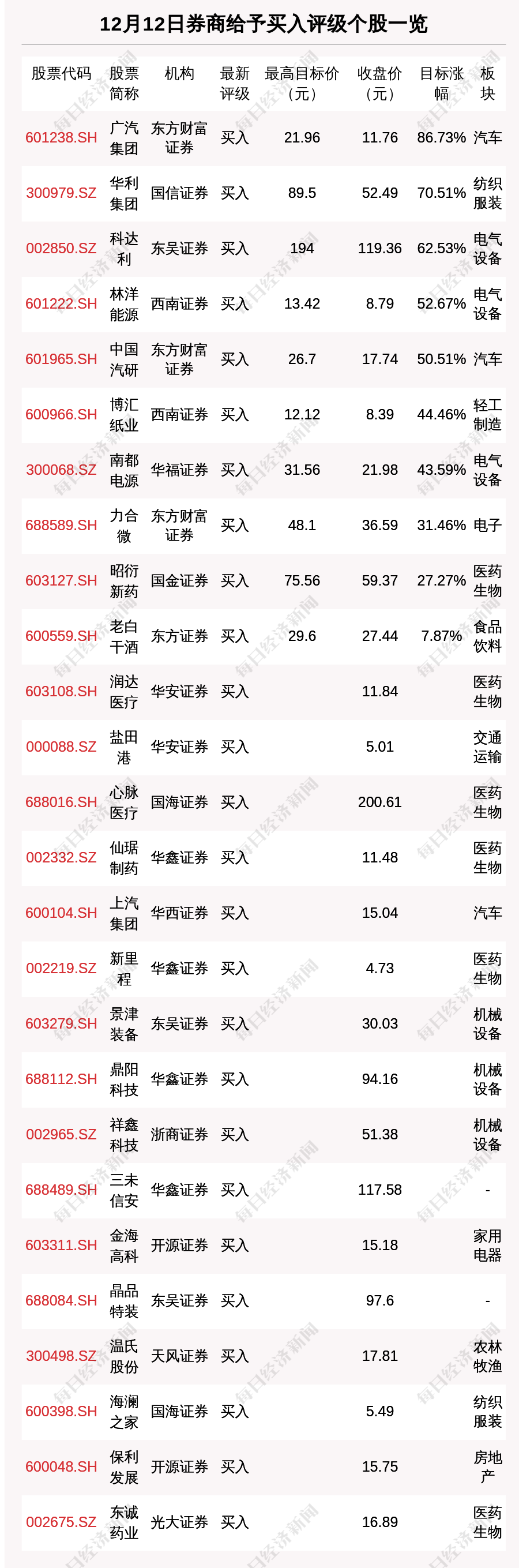 12月12日,券商给予评级的个股数共有47只,获得买入评级的个股数共有26只。在公布了目标价格的10只个股中,按照最新收盘价计算,预期涨幅排名居前的个股是广汽集团(601238.SH)、华利集团(300979.SZ)、科达利(002850.SZ),预期涨幅分别是86.73%、70.51%、62.53%。