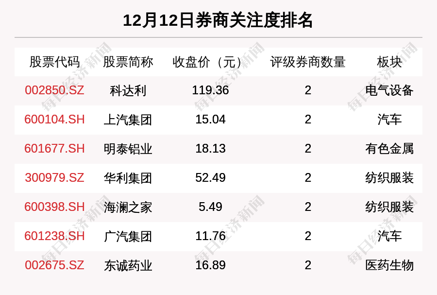 从券商对个股的关注程度来看,有7只个股获得多家券商关注,券商关注数量排名居前的个股是科达利(002850.SZ)、上汽集团(600104.SH)、明泰铝业(601677.SH)。