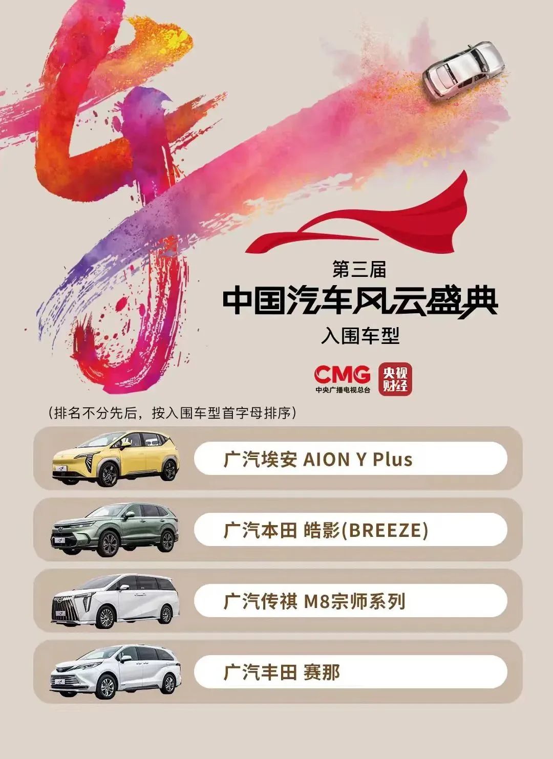 2月24日,由央视广播电视台主办、财经节目中心特别策划的第三届CCTV·《中国汽车风云盛典》公布入围车型。经专家团评审投票,32强车型集结亮相!其中,广汽集团旗下的广汽埃安AION Y Plus、广汽传祺M8宗师系列、广汽本田皓影、广汽丰田赛那以及广汽埃安昊铂科技Hyper Tec成功获得专家评委一致认可和推荐,强势入围本届赛事。
