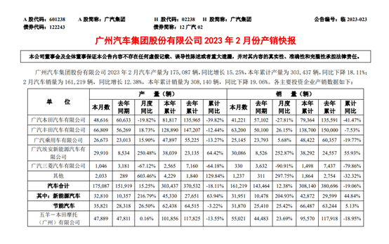 记者日前从官网获悉,广州汽车集团股份有限公司(以下简称“广汽集团”)发布了2023年2月产销快报。数据显示,广汽集团2023年2月汽车销量为161219辆,同比增长12.38%;本年累计销量308140辆,同比下降19.06%。值得一提的是,新能源汽车2月销量31951辆,同比增长204.93%;本年累计销量42872辆,同比增长44.84%。