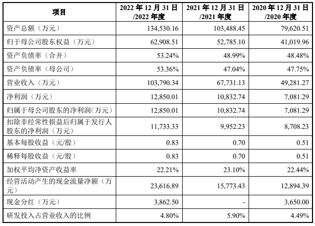 招股书显示,公司主要从事汽车内外饰件研发、生产和销售业务。2020年、2021年和2022年,公司实现营业收入分别为4.93亿元、6.77亿元和10.38亿元;实现归属于母公司股东的净利润分别为7081.29万元、1.08亿元和1.29亿元。报告期内,公司主营业务收入占比分别为99.57%、99.74%和99.42%。公司收入主要来自于为广汽埃安、广汽本田、广汽乘用车等主流整车厂和林骏、广爱兴、河西等一级供应商提供汽车内外饰件。