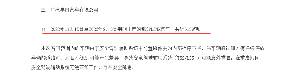 3月1日,广汽丰田汽车有限公司召回信息显示,本次召回2022年11月15日至2023年2月3日期间生产的部分bZ4X汽车,共计6159辆。本次召回范围内的车辆由于安全驾驶辅助系统中前置摄像头的内部程序不当,当车辆通过侧方有连续停放车辆的道路时,对目标识别可能产生差异,导致安全驾驶辅助系统(TSS/LSS+)可能意外重启。在重启期间,安全驾驶辅助系统无法正常工作,存在安全隐患。