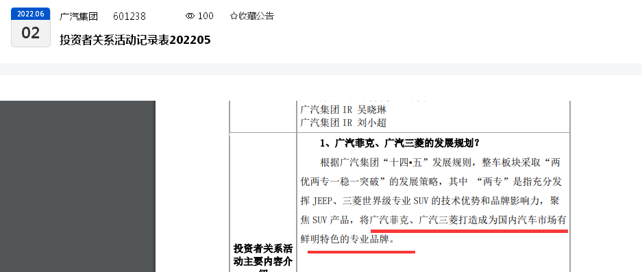 同时,对于广汽三菱,广汽集团亦曾表示,根据广汽集团“十四?五”发展规则,整车板块采取“两优两专一稳一突破”的发展策略,其中“两专”是指充分发挥 JEEP、三菱世界级专业 SUV 的技术优势和品牌影响力,聚焦 SUV 产品,将广汽菲克、广汽三菱打造成为国内汽车市场有鲜明特色的专业品牌。