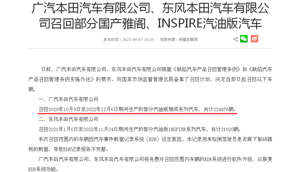 4月7日,广汽本田汽车有限公司召回信息显示,召回2020年10月9日至2022年12月6日期间生产的部分汽油版雅阁系列汽车,共计224476辆。本次召回范围内的车辆因汽车事件数据记录系统(EDR)设定原因,未记录用来检测驾驶员是否踩下制动踏板的数据,导致EDR记录报告不完整。