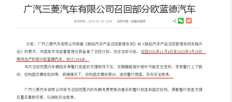 2月24日,日前,广汽三菱汽车有限公司召回信息显示,本次召回2021年11月4日至2022年9月29日期间生产的部分欧蓝德汽车,共计1064台。本次召回范围内车辆因车身警灯底座的支撑刚性不足,在颠簸路面行驶时可能发生变形,导致警灯上下跳动、拉钩固定螺栓松动等。极端情况下,拉钩固定螺栓脱出,造成警灯脱落,存在安全隐患。