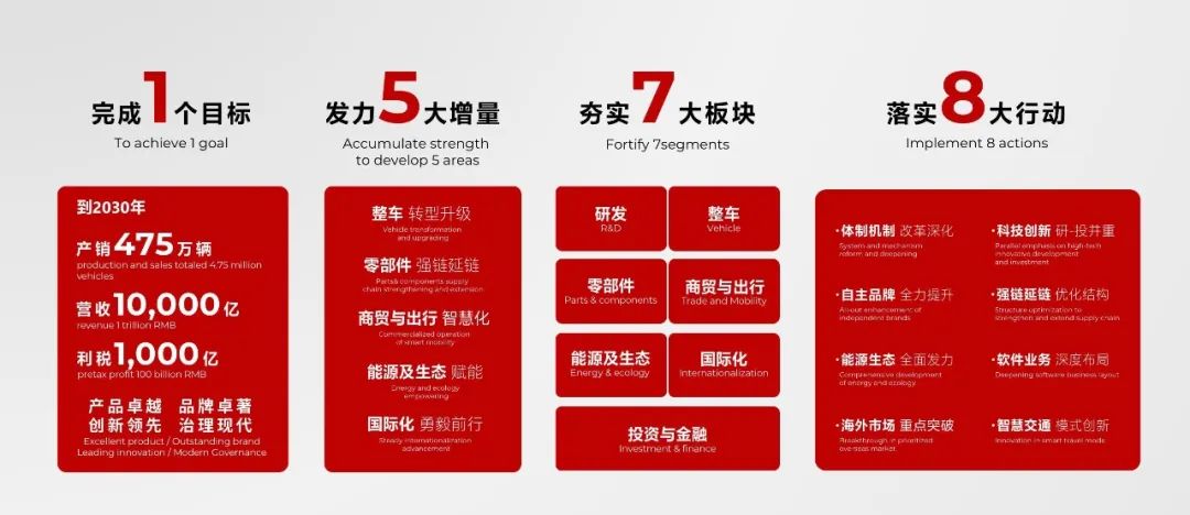 2022年年底,广汽集团发布了面向2030年的万亿广汽蓝图,即“万亿广汽1578发展纲要”。通过发力5大增量、夯实7大板块、落实8大行动,力争2030年实现产销超475万辆、营收1万亿、利税1千亿的目标,成为产品卓越、品牌卓著、创新领先、治理现代的世界一流科技企业。