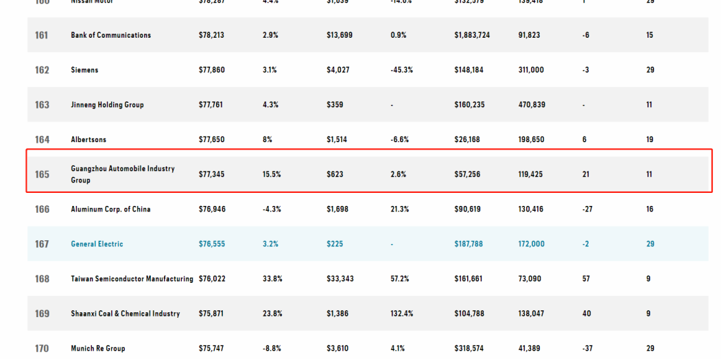 着眼汽车行业,中国作为全球最大汽车市场,有9家中国汽车企业榜上有名,广汽集团名列第3。值得注意的是,广汽集团已连续11年上榜,最新排名165位,比去年排名上升21位,创造历史最好成绩。