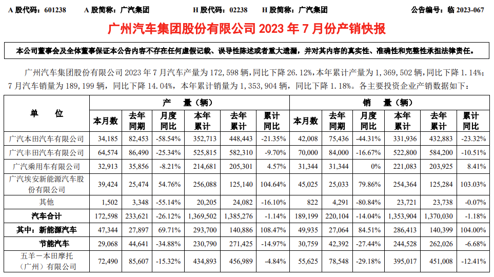 记者日前从官方获悉,广汽集团发布了2023年7月产销快报。根据数据显示,7月汽车合计销量为189199辆,同比下降14.04%,。本年累计销量为 1,353,904 辆,同比下降 1.18%。其中,新能源汽车7月销量为49935辆,同比增长84.51%,本年累计销量28.64万辆,同比增长104%。
