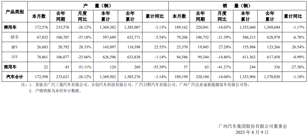 具体来看,今年 7 月,广汽本田产量同比下降 58.54%,销量同比下降 44.31%;广汽丰田产量同比下降 25.34%,销量同比下降 16.67%;广汽埃安新产量同比增长 54.76%,销量同比增长 79.86%。