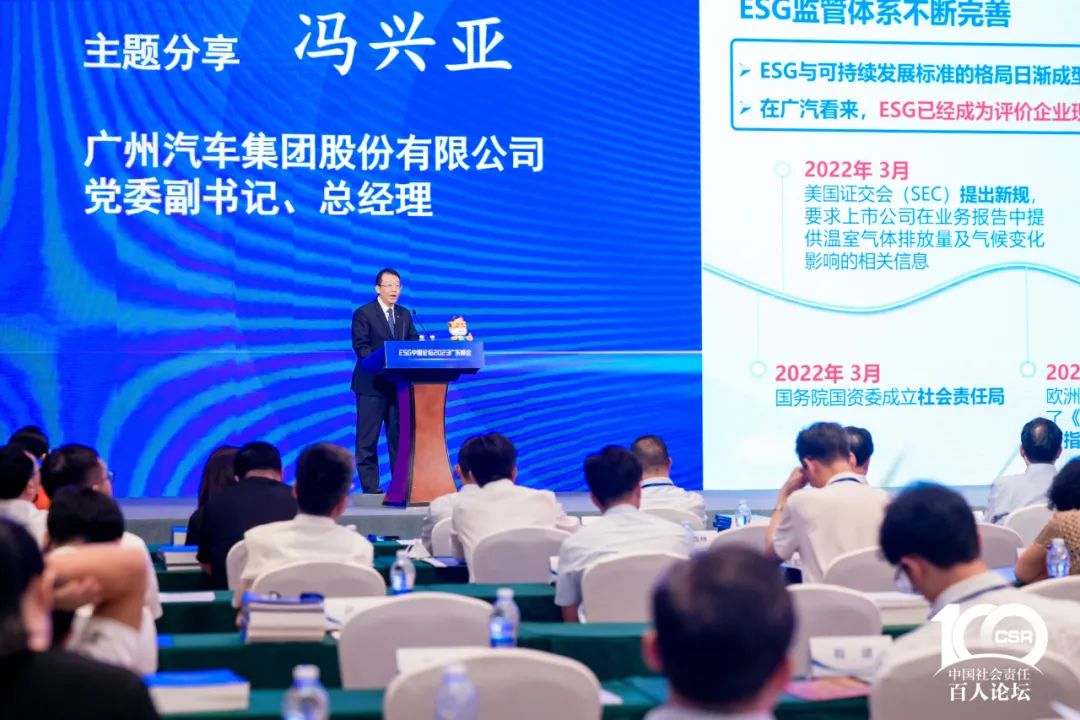国务院国资委原党委委员、秘书长彭华岗,全国社会保障基金理事会原副理事长陈文辉,广东省国资委党委书记、主任余钢,中国上市公司协会党委书记、执行副会长柳磊等领导专家出席活动并致辞。广汽集团总经理冯兴亚受邀参加峰会并作主题为《ESG理念推动高质量发展,助力中国式现代化建设》的演讲。
