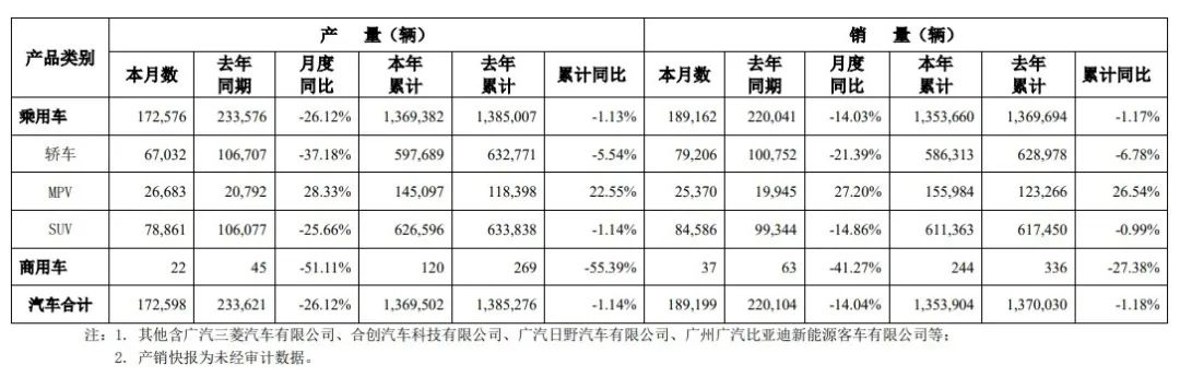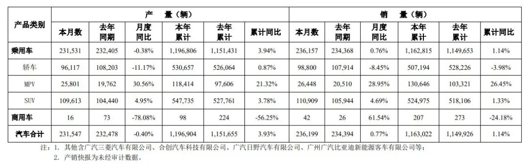 同期,广汽集团实现汽车产销119.69万辆和116.30万辆,同比增长3.93%和1.14%。