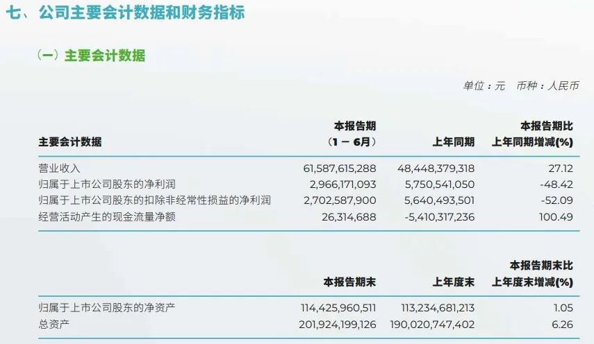 合并口径营业总收入约619.11亿元,同比增加27.16%;归属于上市公司股东的净利润约29.66亿元,同比下降约48.42%。