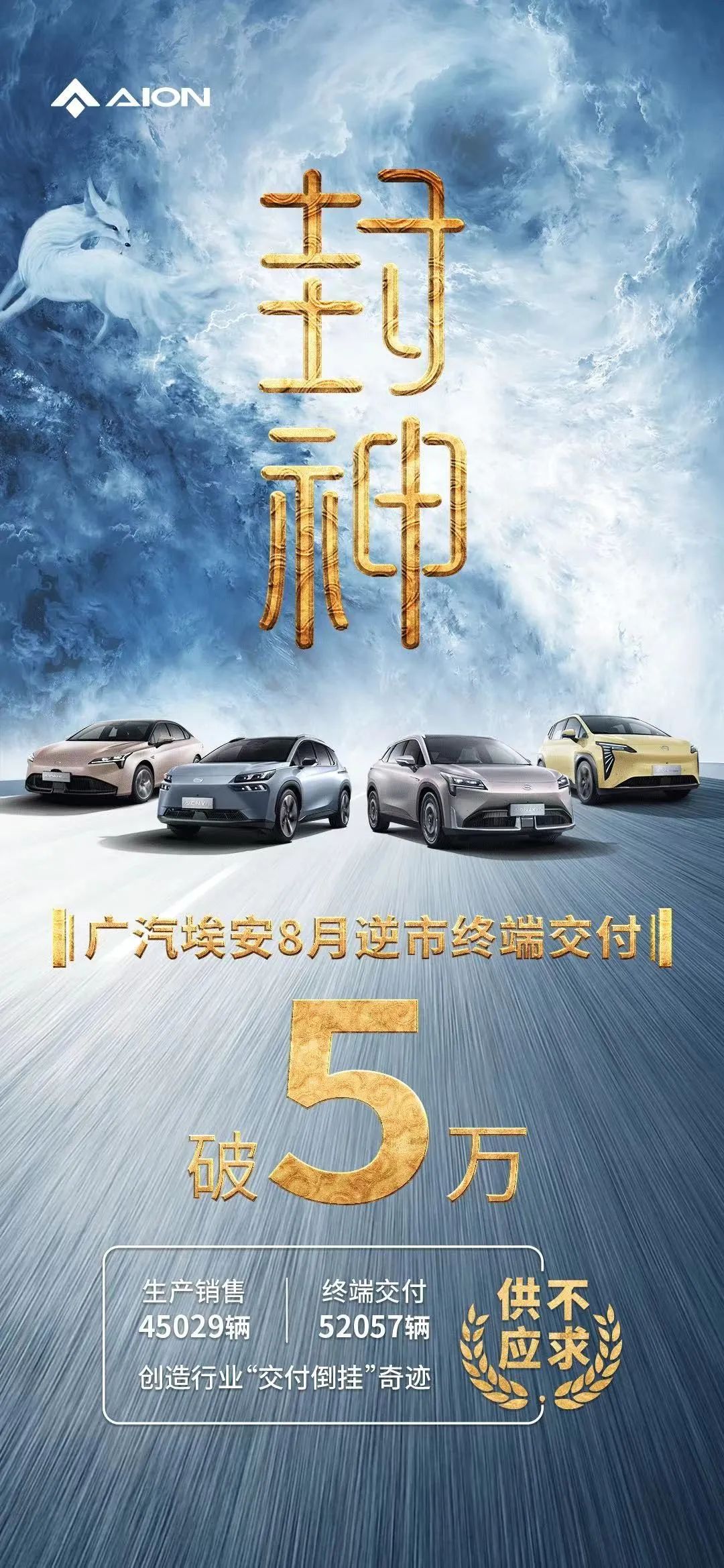就在2023年半年报发布不久,广汽集团旗下的新能源汽车品牌埃安宣布,8月销售4.5万辆,但在终端交付上突破了5万,达52057辆,创下“交付倒挂”。