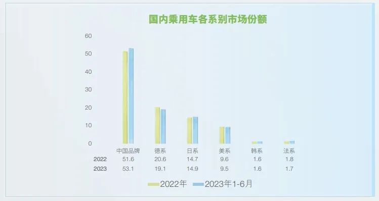 2023上把半年,中国品牌乘用车共销售598.6万辆,同比增长22.4%,占乘用车销售总量的53.1%,占有率比上年同期提升5.9个百分点。