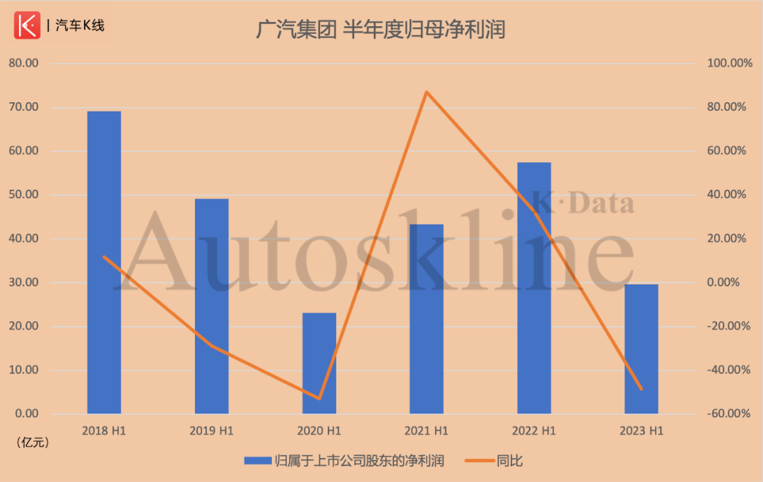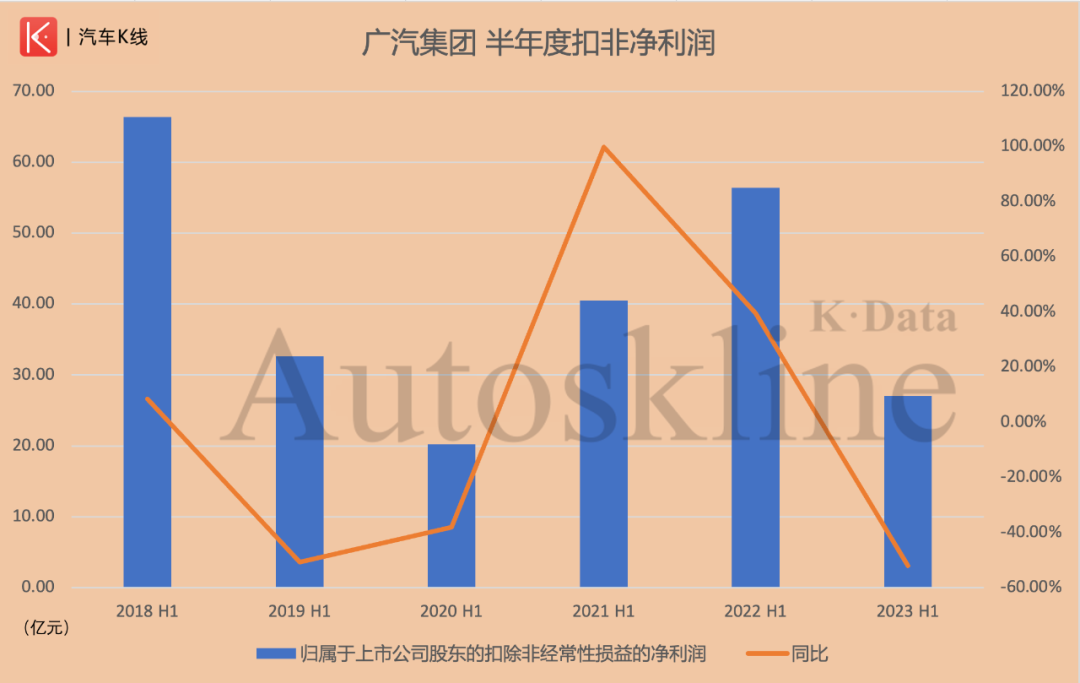 财报显示,广汽集团2023上半年归属于上市公司股东的净利润(以下简称“归母净利润”)为29.66亿元,同比下降48.42%;归属于上市公司股东的扣除非经常性损益的净利润(以下简称“扣非净利润”)为27.03亿元,同比下降52.09%。盈利表现仅好于2020年同期水平。