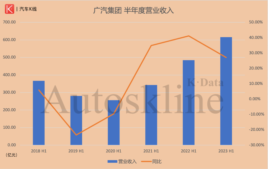 财报显示,广汽集团2023上半年营业收入为615.88亿元,同比上涨27.12%,营收水平创下近年同期新高,同比增速也远高于行业平均水平。
