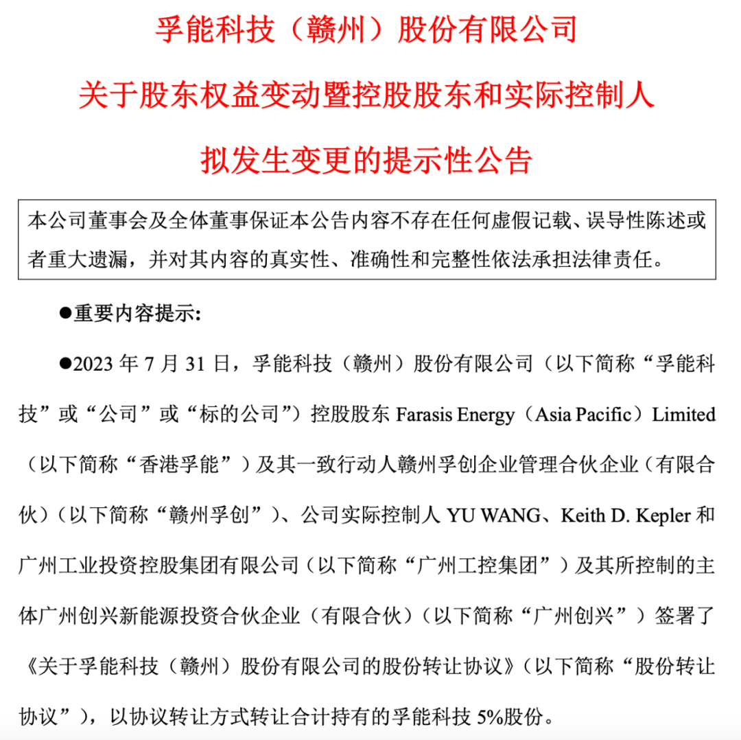 时隔不久,香港孚能、赣州孚创、孚能科技的实际控制人和广州工控集团所控制的主体——广州创兴签署协议,宣告孚能科技控制权易主广州国资。